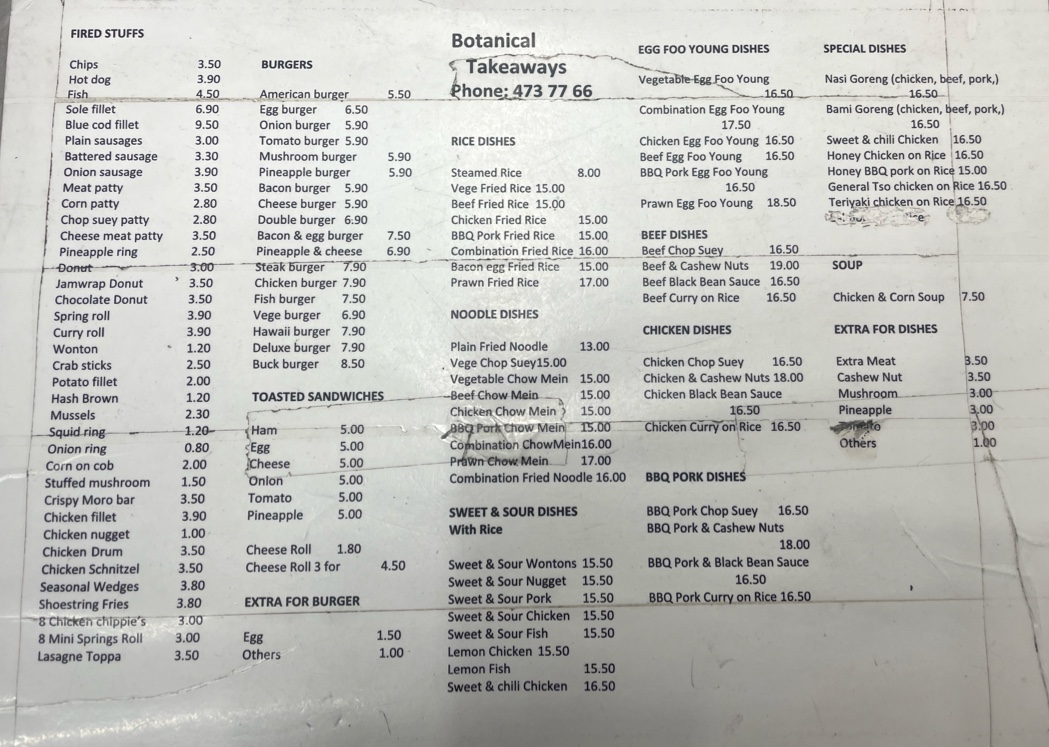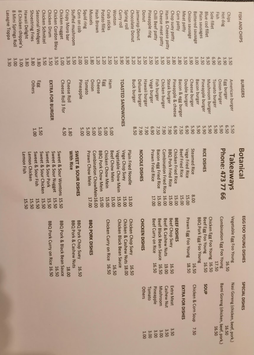 Welcome to Botanical Takeaways, a charming fish and chips restaurant located in North East Valley, New Zealand. With a diverse menu that boasts mouthwatering burgers, savory egg foo young dishes, and classic fish and chips, there's something for everyone. Whether you opt for the American Burger or indulge in the vegetable egg foo young, you'll find generous portions and delightful flavors at accessible prices. Customers rave about the excellent value and quick service, with many calling it a culinary gem worthy of a repeat visit. The inviting atmosphere enhances the dining experience, making it a perfect spot for friends and families alike. Diners appreciate the friendly staff, who are eager to help guide you through the menu. Join the culinary adventure at Botanical Takeaways, where each bite promises to be a tantalizing delight!